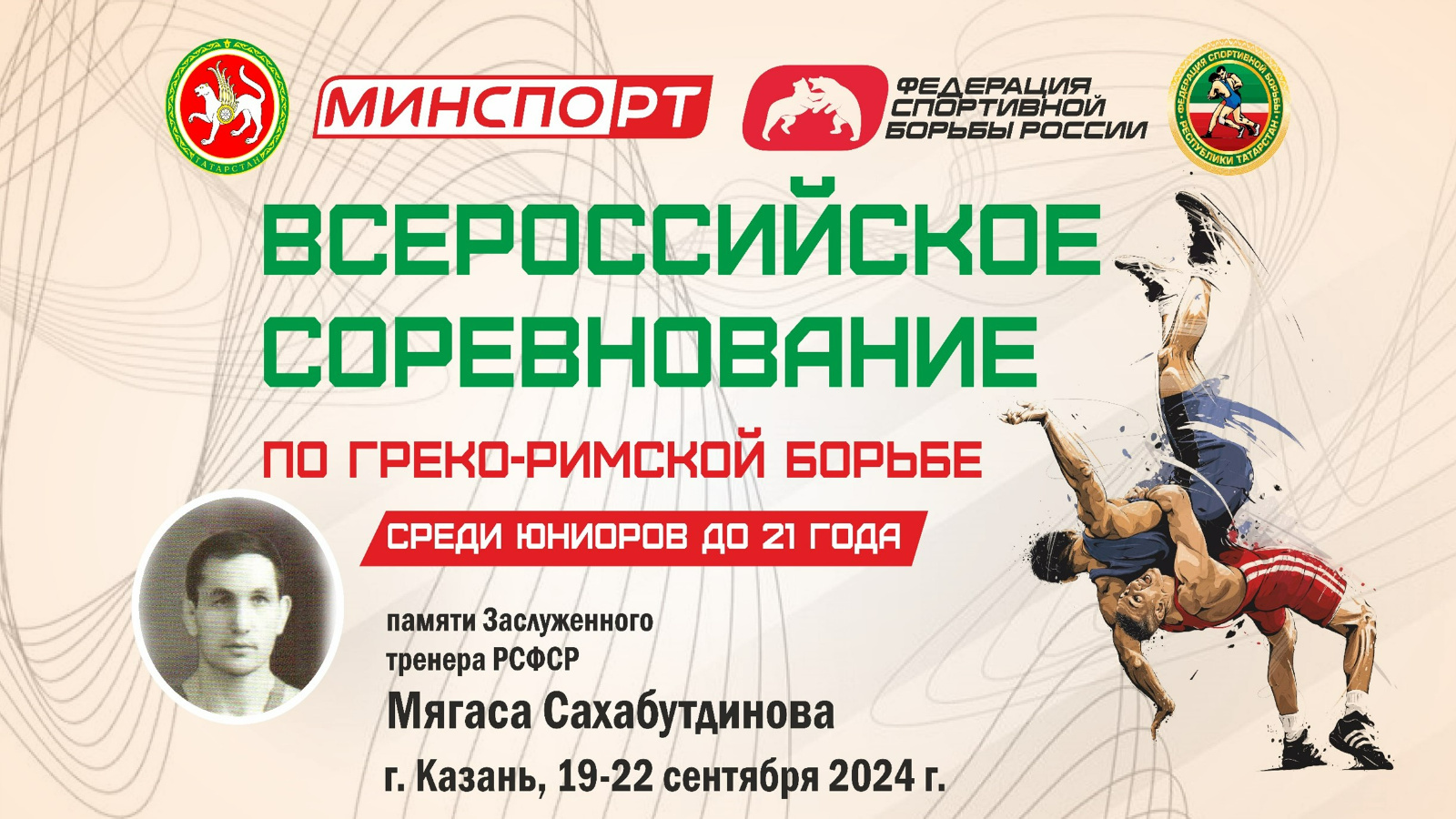 С 19 по 22 сентября 2024 года в Казани на коврах Дворца единоборств «Ак Барс» пройдет ХI Всероссийское соревнование по греко-римской борьбе среди юниоров до 21 года памяти заслуженного тренера РСФСР Мягаса Мубаракшиновича Сахабутдинова.
