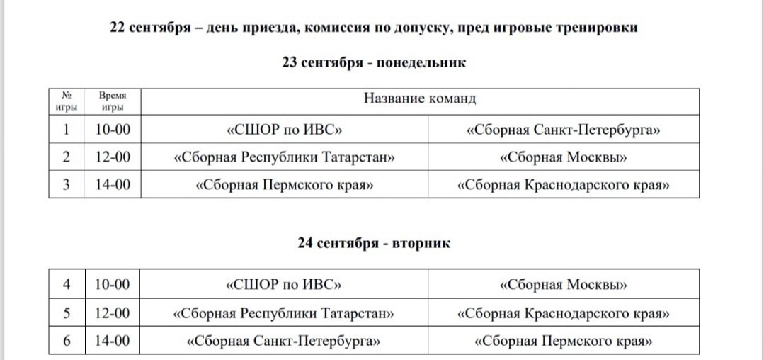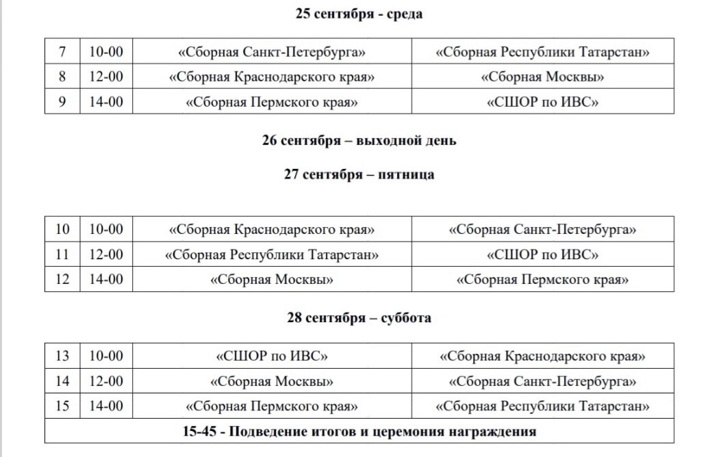 Соревнования пройдут с 23 по 28 сентября. В борьбе за медали принимают участие 6 команд – СШОР по ИВС (Московская область), сборные Москвы, Санкт-Петербурга, Пермского и Краснодарского краев, Республики Татарстан.