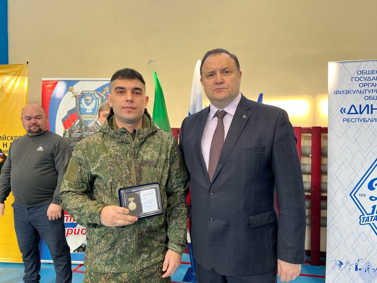 Далее перешли к награждению высшими наградами Общества «Динамо» Республики Татарстан. Памятной медалью «Динамо» РТ наградили заместителя главы города Чистополь Михаила Ксенофонтова. Звание «Почётный динамовец» РТ присвоили рядовому, стрелку, члену Республиканской Ассоциации ветеранов СВО Никите Горячеву.