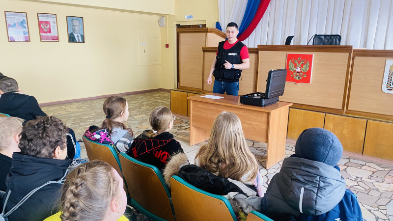 Далее ребята пошли на ознакомительную экскурсии по зданию ОВД, которую провела инспектор направления по связям со СМИ Надежда Назарова. В своем выступлении она рассказала ребятам о работе подразделений полиции и об основных задачах, возложенных на них.