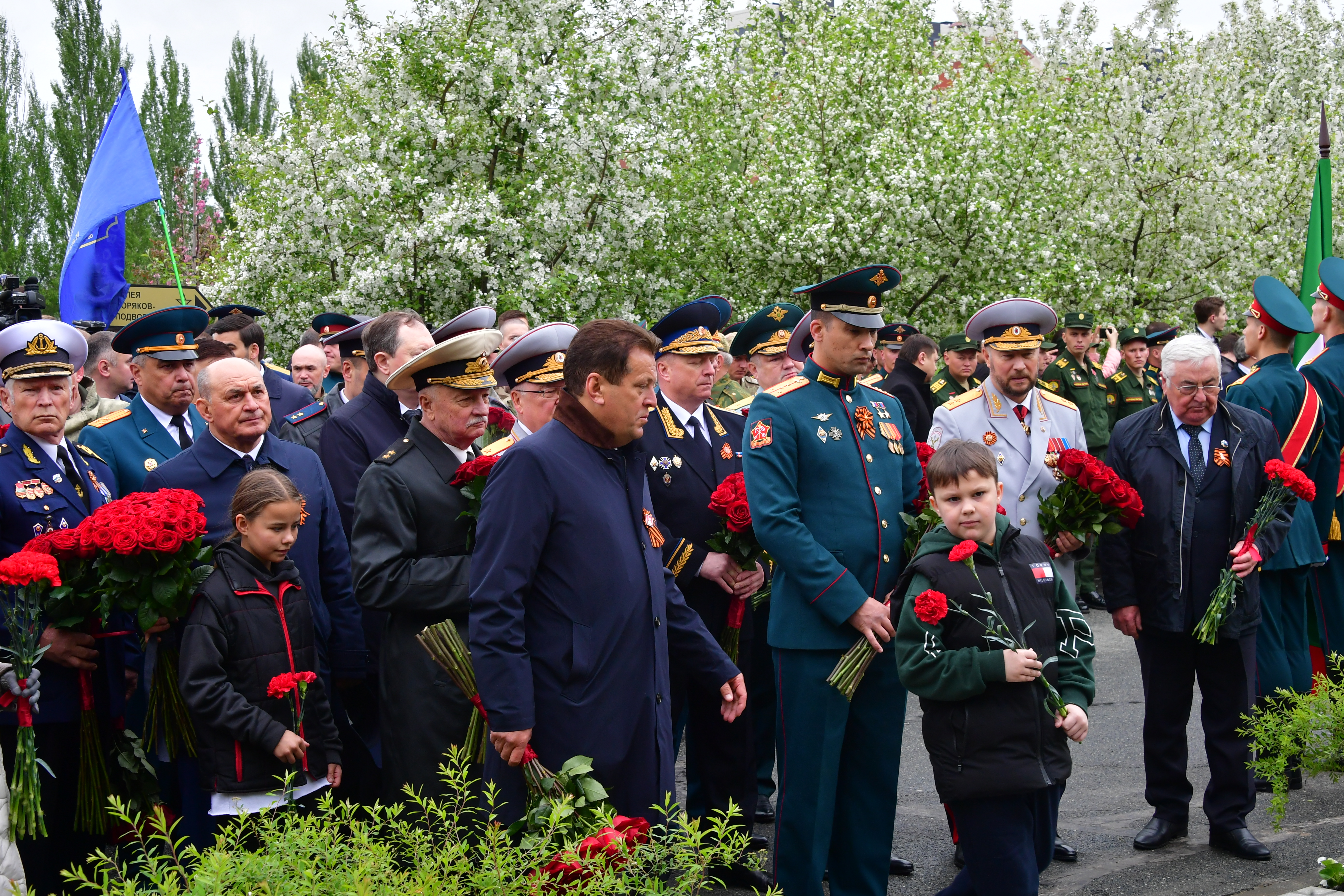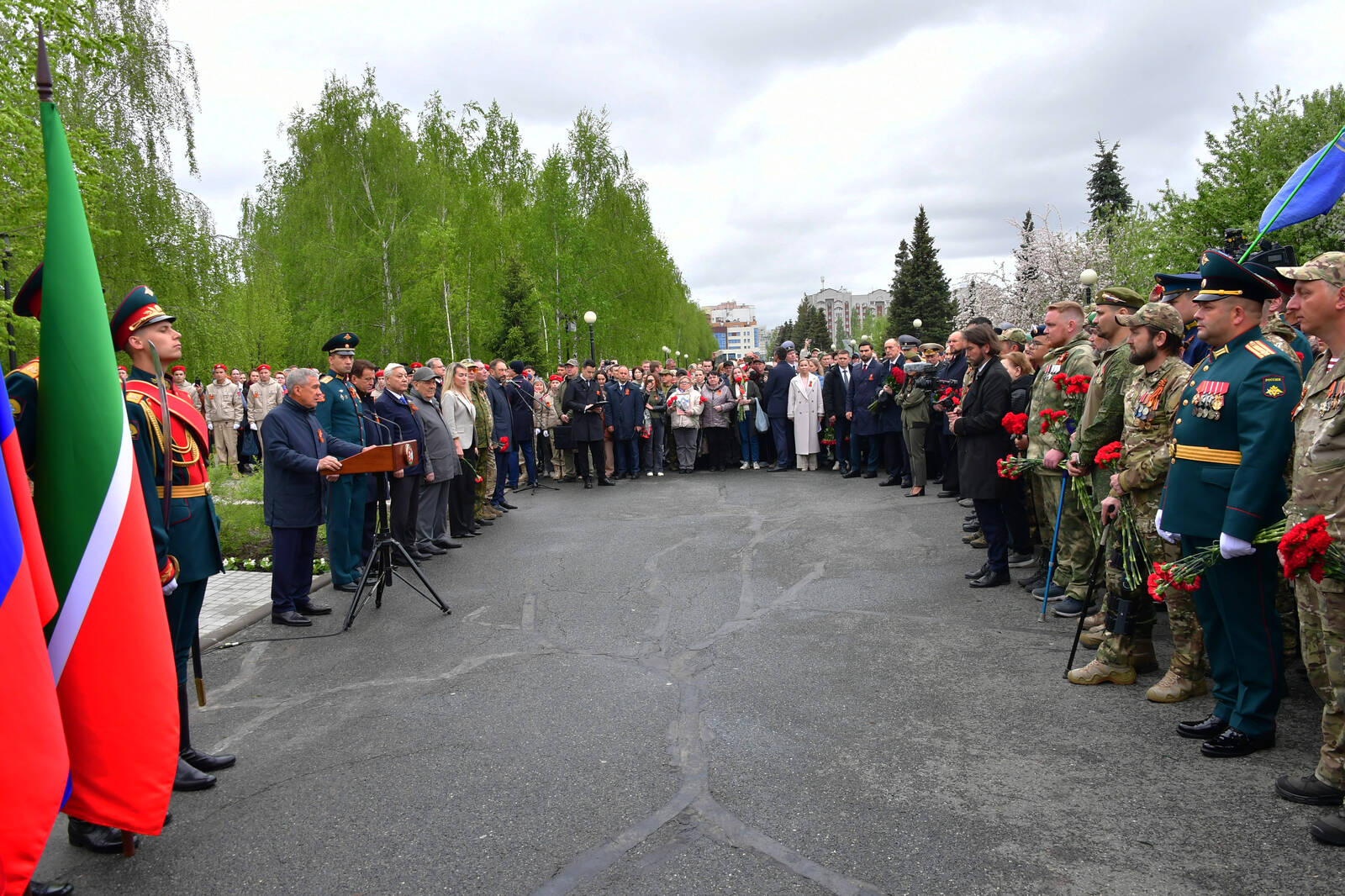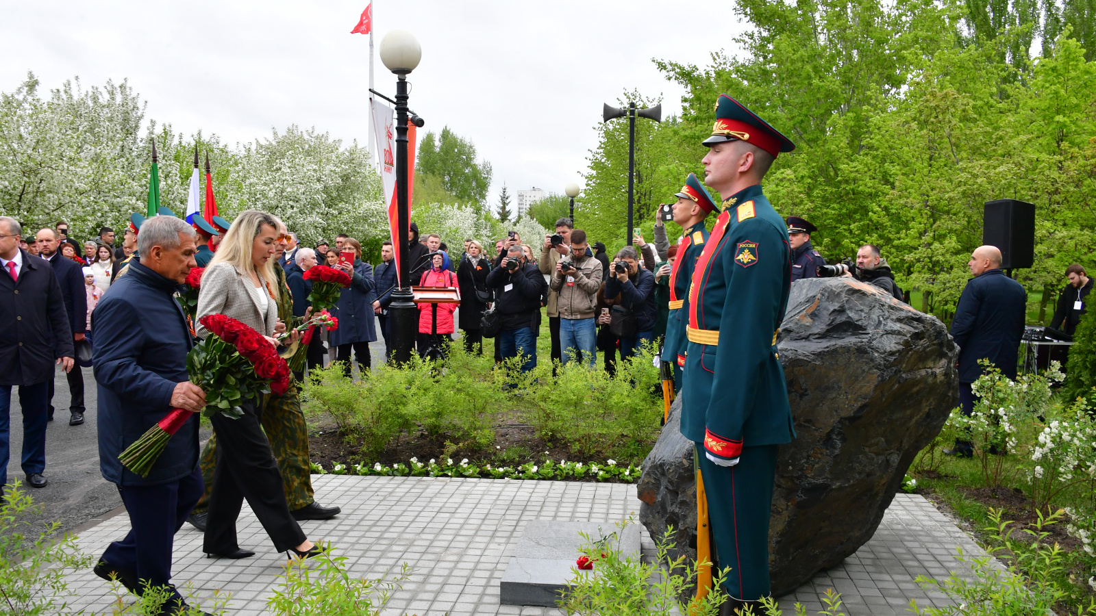 В День Победы Раис Татарстана Рустам Минниханов принял участие в торжественном митинге, посвященном установке памятного камня на месте строительства мемориального комплекса участникам Специальной военной операции. Церемония прошла в Парке Победы.