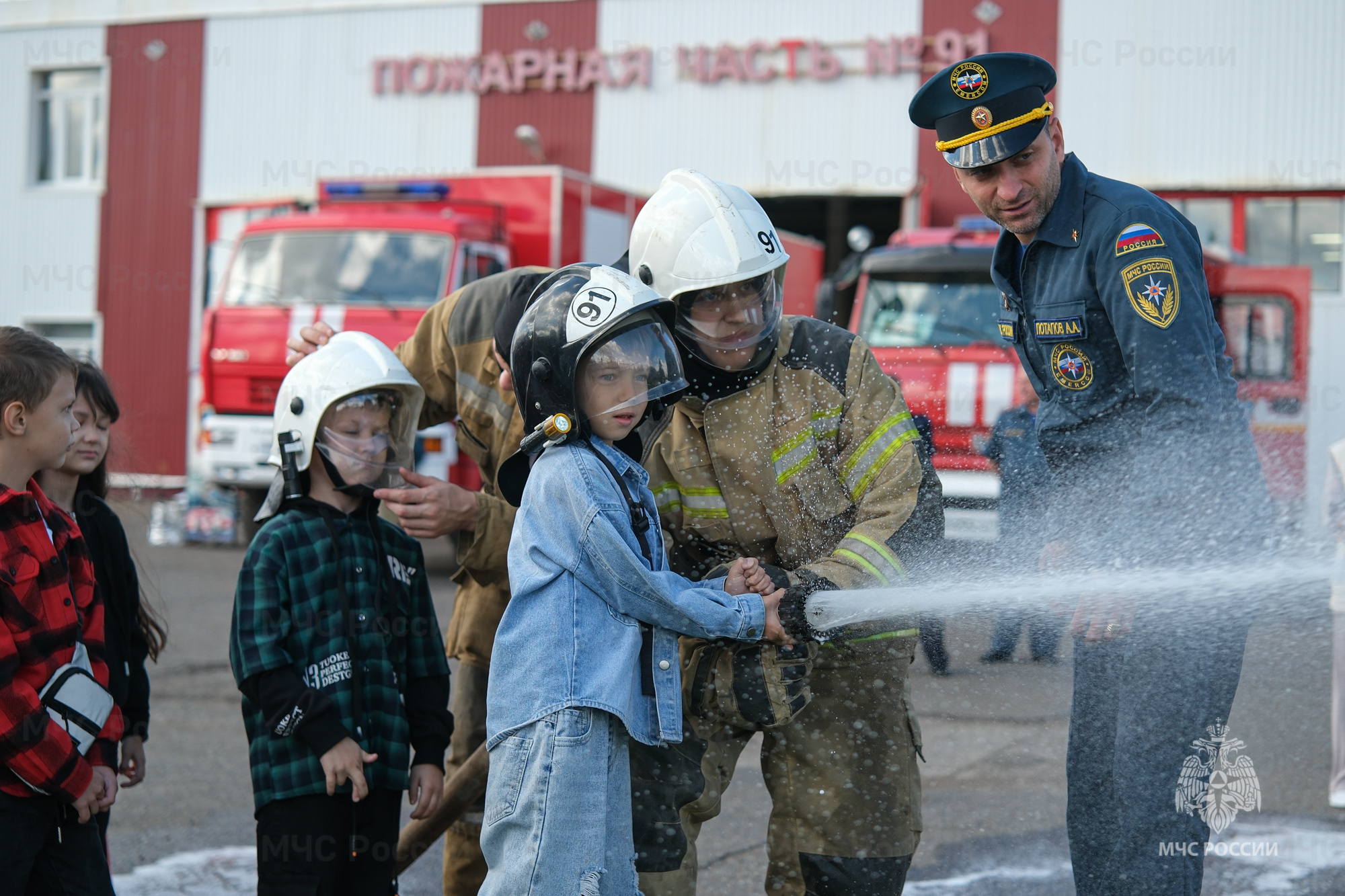 Гости посмотрели мультипликационный фильм о правилах пожарной безопасности «Спасик и его друзья», примерили боевую одежду и исследовали пожарные автомобили, а так же смогли поразить мишень напором воды из пожарного ствола. Вручив материальную помощь для подготовки к школе, председатель Совета ветеранов отряда Александр Пустовой обратился к детям напутствием: