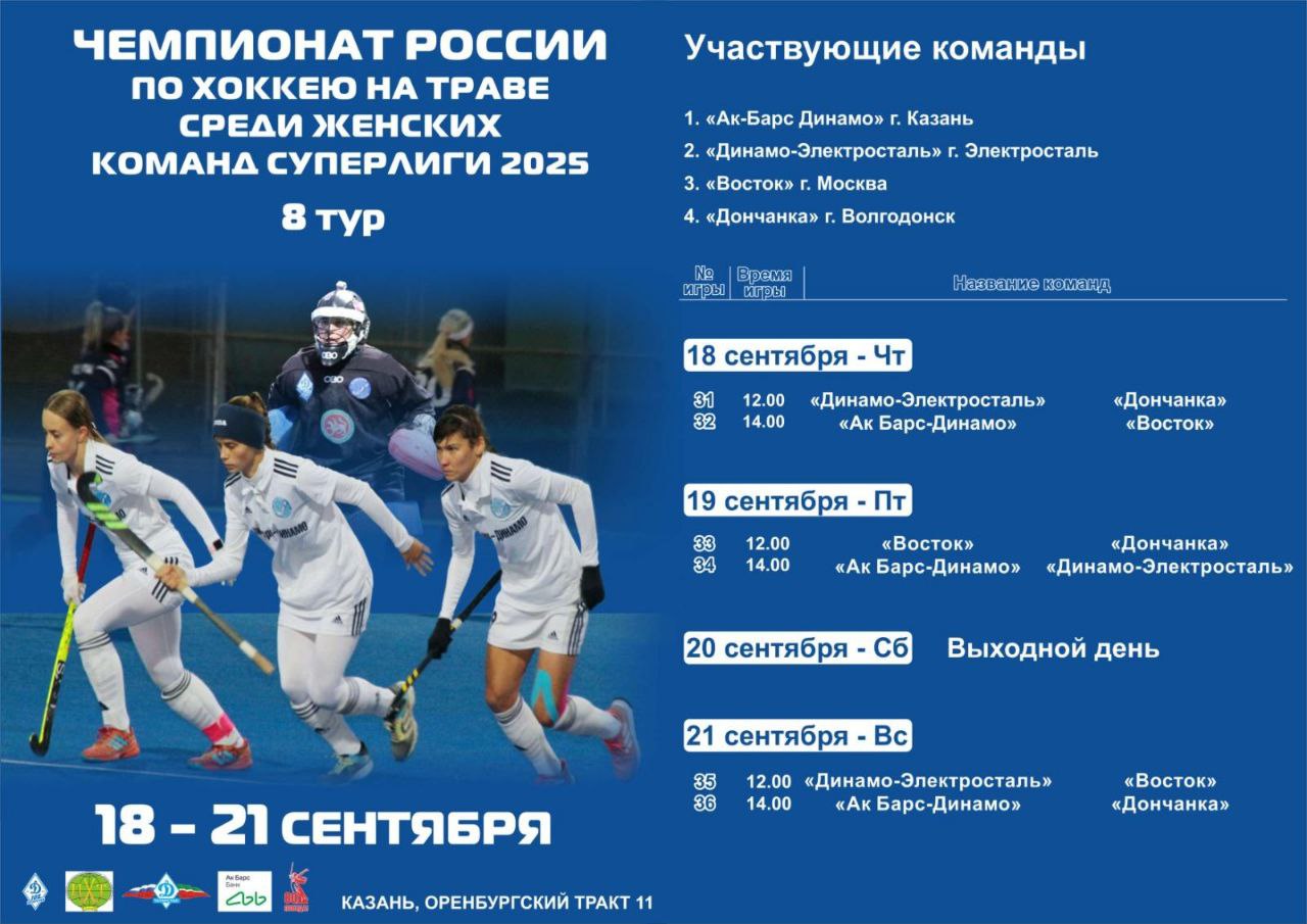 С 18 по 21 сентября в Казани, на поле Центра хоккея на траве, пройдут матчи заключительного 8-го (общего) тура чемпионата России по хоккею на траве среди женских команд Суперлиги.