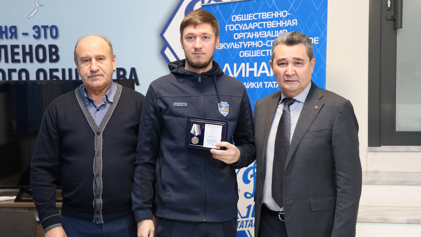 Юбилейные медали «100 лет Обществу «Динамо «Республики Татарстан» всем отличившимся в победном для динамовского клуба Кубке «Волга-Спорт-Арены», вручил первый заместитель председателя «Динамо» РТ, заслуженный работник физической культуры РФ Салават Гайсин.