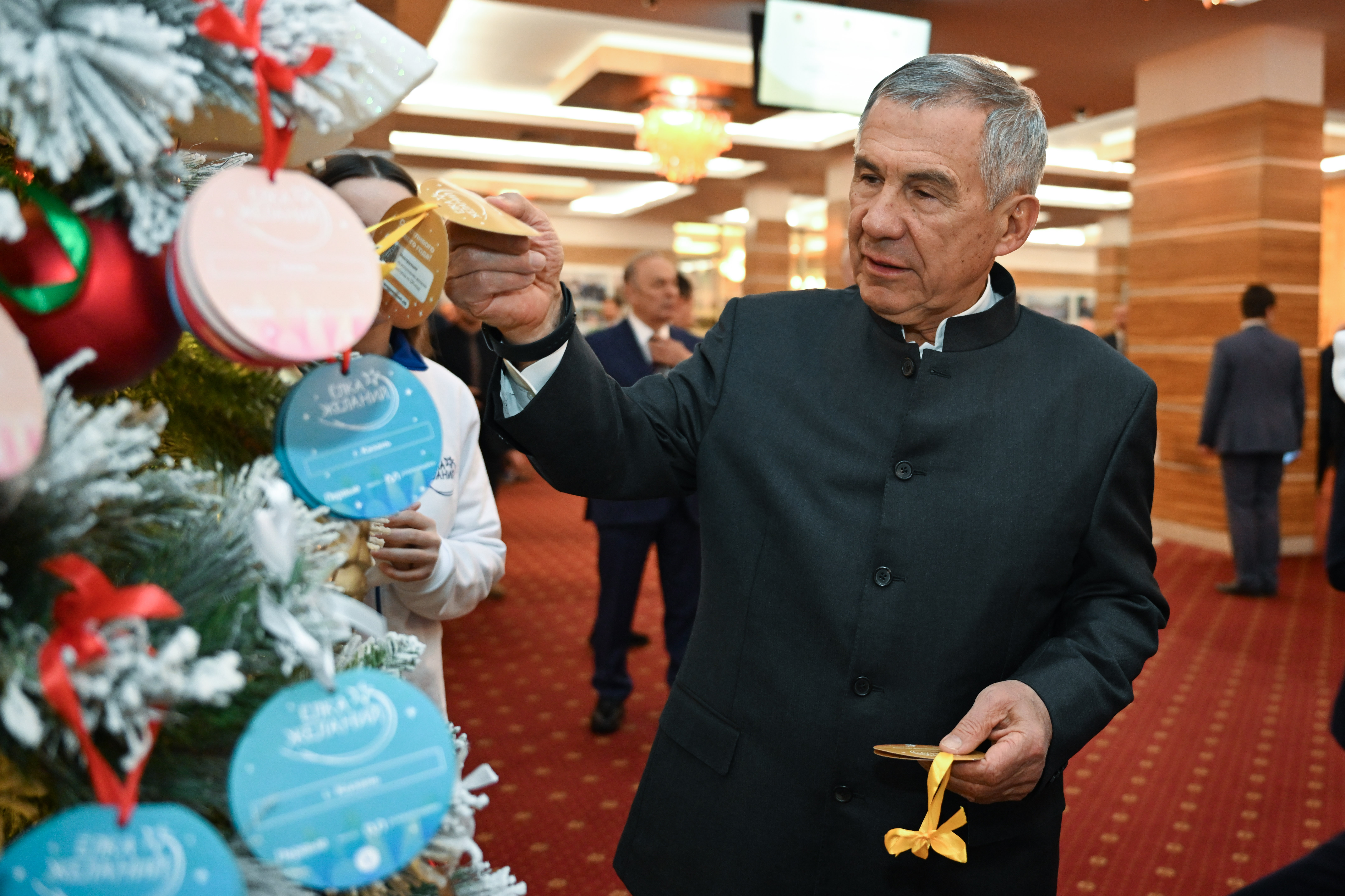 Раис Татарстана Рустам Минниханов снял с елки открытки с желаниями 5-летнего Егора из г. Набережные Челны, который мечтает об игровой кухне, 12-летнего Раниса из Казани, загадавшего на Новый год беспроводную колонку, и 9-летнего Максима из г. Рубежное Луганской Народной Республики, мечтающего о шведской стенке. Неделей ранее Рустам Нургалиевич принял участие в благотворительной акции в Казанском Кремле и взял на исполнение три детские мечты.