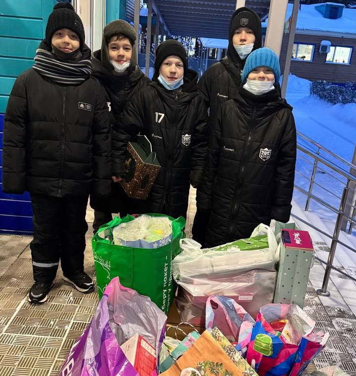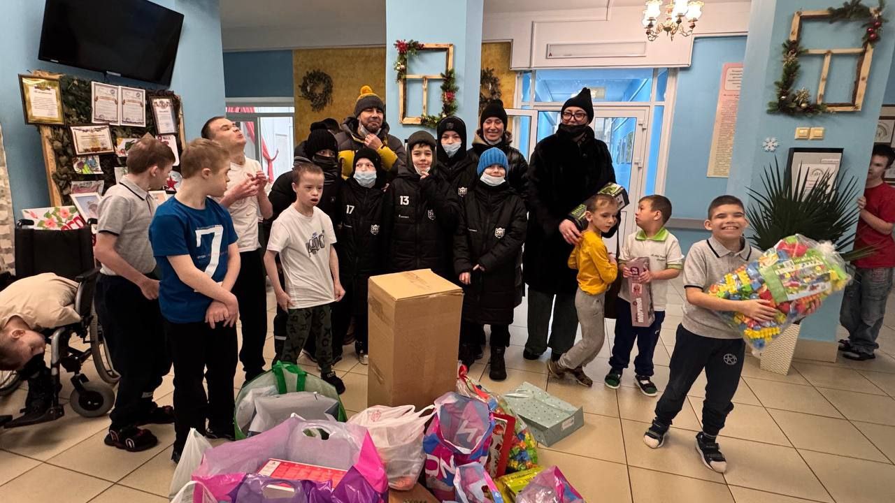 Этот момент стал настоящим праздником! Юные хоккеисты от всей души поздравили воспитанников интерната с наступающим Новым годом и вручили им подарки.